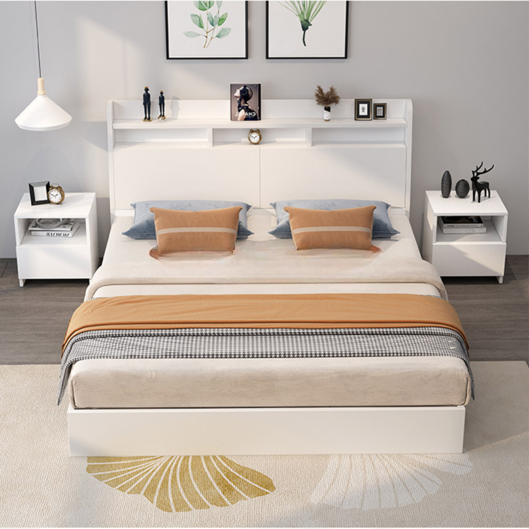 - Structure : Integrated headboard with built-in bookshelves or decorative storage compartments.